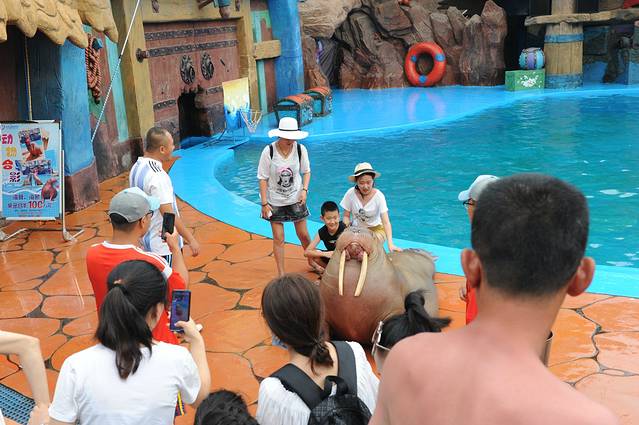 吃饭东西 刚好欢乐剧场的表演也开始啦 伴随着欢乐的BGM小丑演员和主持人都陆续开始了他们的表演 还有会做仰卧起坐的海象 还有滑溜溜的小海豹 真的太逗了 主持人也十分幽默 还有一位漂亮的小姐姐被请到台上去和海豹互动 太幸运了