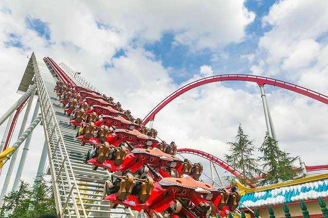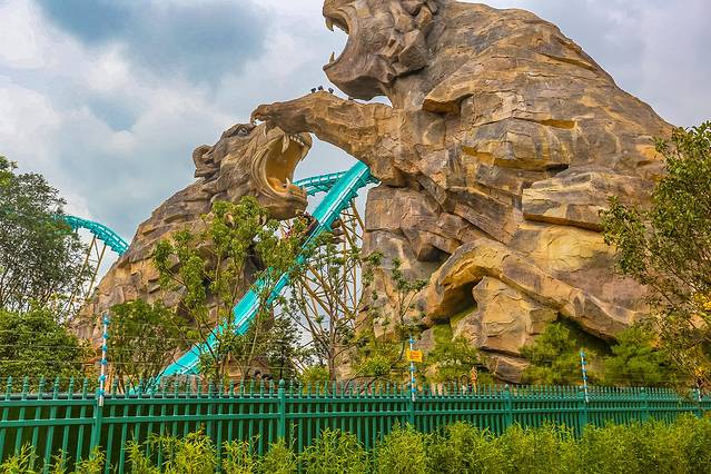 如果这些还不能让你感到惊险刺激,那么就去“虎跳峡激流勇进”吧!以玉龙、哈巴两座雪山为原型的猛虎雕像,托起总长390米,高30.5米,最高运行速度75公里每小时的激流勇进项目,敢去征服它吗?
