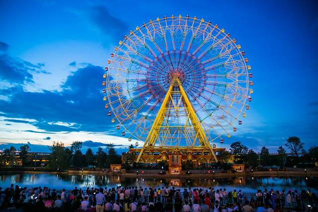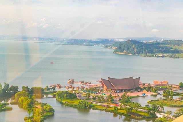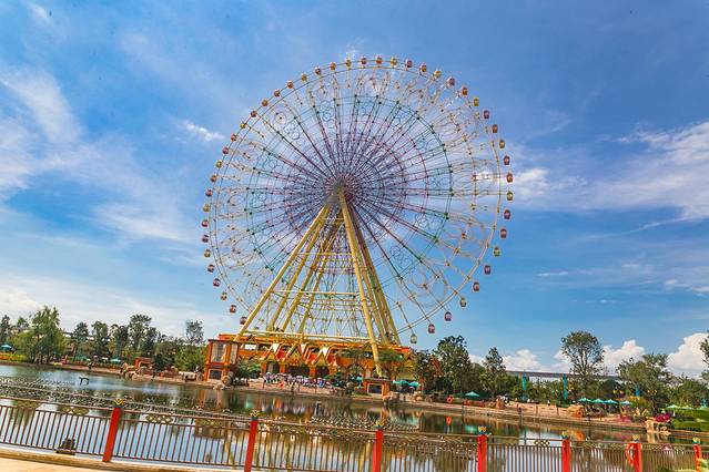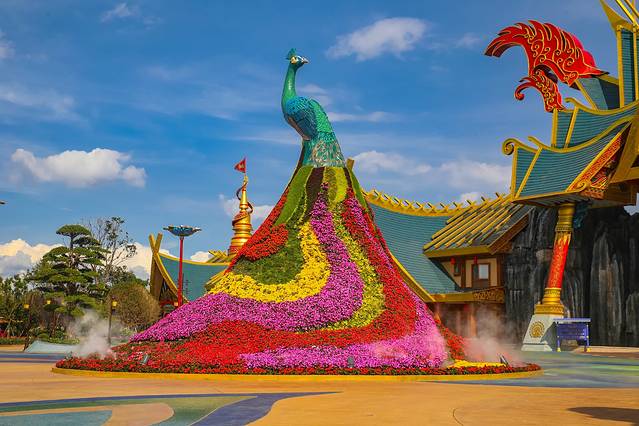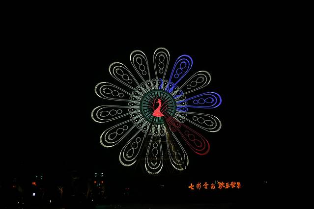 “四季花海”最吸引眼球的,还是那座巨大的“滇池之眼”,如果你去过天津,想必很容易就猜出来这是什么——没错,这是一座以孔雀为主题的超高摩天轮,总高度108米,在设计上充满了民族元素,转动之时,犹如孔雀开屏,置身其上,能将园外五百里滇池的美景尽收眼底。