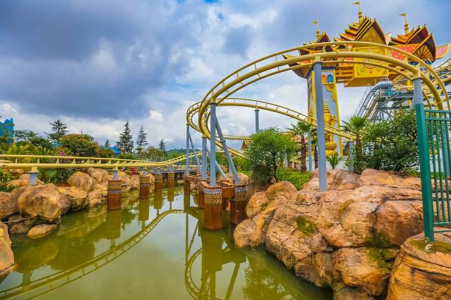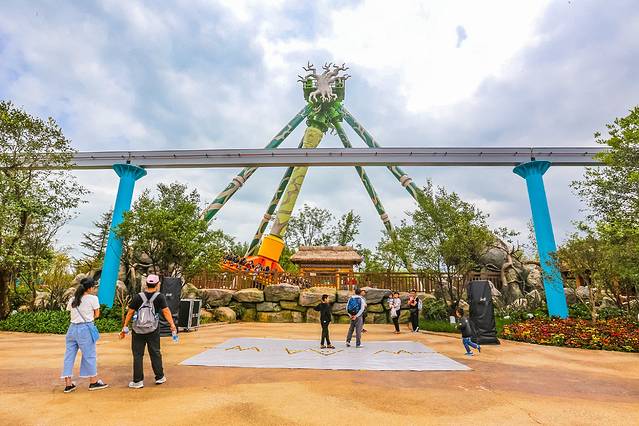 过了“幻滇奇域”,就是“滇军营地”。甫一进入,便有种万箭齐发,战鼓惊雷的气氛,顾名思义,这一区域是以古滇军队为基调营造的刺激型游乐项目。这里的几个主打项目,一个比一个刺激,绝对让你肾上腺素狂飙。首先是“高空飞翔”,将近50米的设施,让你在升降和旋转中,体验御风飞行的惊险与快感。然后是“象戏游龙过山车”,我强烈推荐,必玩项目。怎么说呢,那就感觉就像是被当做子弹弹射出去一样,让人酣畅淋漓,十分爽快。
