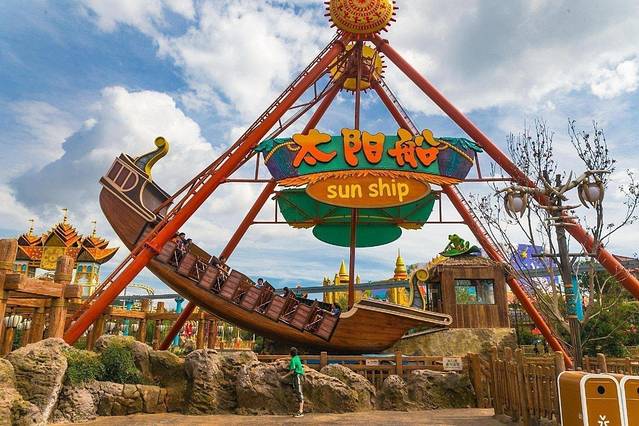 除了“双塔太空梭”,还有更刺激的“太阳船”,像一个大摆钟一样,时而直冲云霄,时而跌落谷底,如果你敢在玩这个的时候睁开眼,那你可真是个猛士。