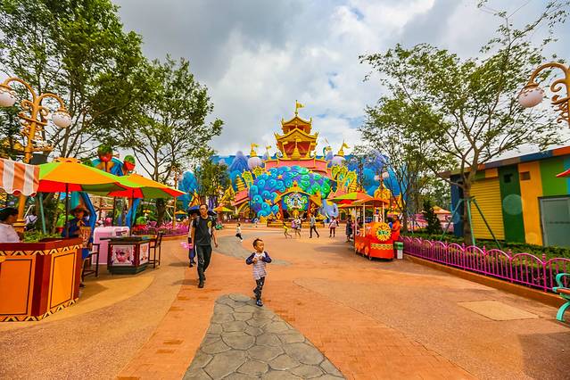 如果从“四季花海”出来你选择了另一个方向,那么你就会来到“童梦世界 ”。听名字就能知道,这里是小孩子们的乐园,里面有宝贝乐园,可以在玩中学习,还有旋转木马、转转杯、自控飞机、童趣天地等游玩设施。也是很齐全了,带着孩子过来的话,不妨进去转一转。