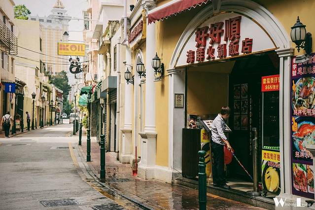 官也街(下图)由施督宪正街与告利雅施利华街之间起,至消防局前地,北与地堡街 、消防局前地成T字型相交,不要小看了这条只有约115米长,5米宽的小街。街内中西食肆林立,还有数间售卖当地特产、糕点的手信店。