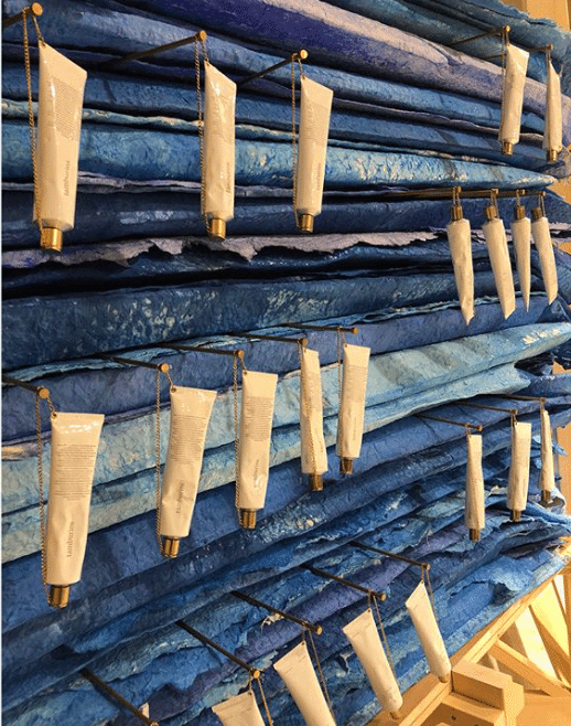接下来这是在网上很多人都有的照片了,“护手霜海洋‘ 不同蓝色宣纸排列而成的蓝色护手霜海洋, 这是从开店以来唯一没有变过的一处空间,吊挂着的三四十多个护手霜真是独具一格的摆设啊。