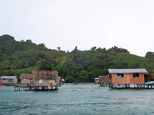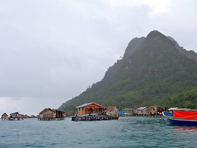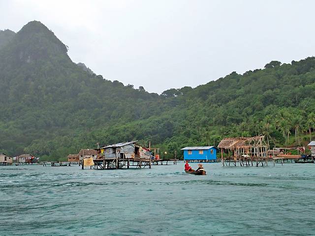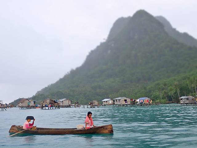 伴着大风大雨坐了半个小时的船,终于来到第一站——巴瑶族生活的村落。200米的半径范围内,一个个看起来残破不堪的水上屋直立散布在四周,不是某侧的木板漏了洞就是承接的木条缺了口,四个角的支撑腿看起来惴惴不安。巴瑶族人们三三两两的聚在一起做着生活琐事,小孩不是在船上就是在 水里 玩闹。