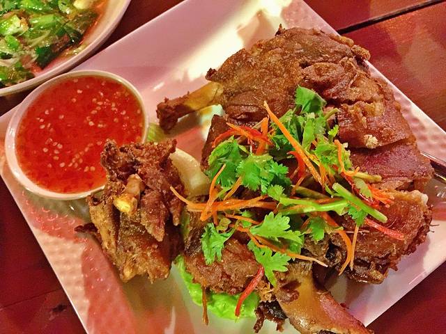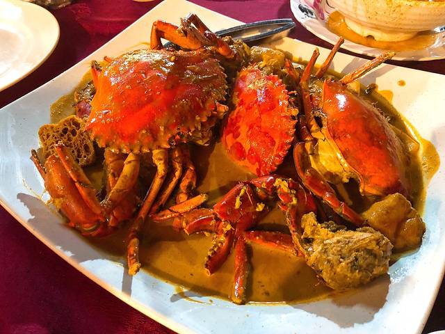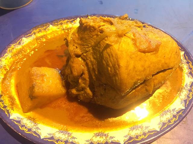 2. 马来餐厅、奶茶: 海丰 精品酒店楼下第一家绿色招牌的马来餐厅,是一家鲜少有 中国 游客会去的马来当地餐馆。猴胖觉得在考证期间我们都老老实实的吃炒饭炒面比较稳妥,于是来了这家不卖海鲜的店。这是我这辈子第一次见过一份咖喱鸡,上菜以后土豆只有1块,还没有鸡肉大,鸡肉是一整块和拳头般大小的净肉。这顿饭是我们在 仙本那 吃过最便宜的一餐,2人份的海鲜炒饭7马币,咖喱鸡4马币,1杯奶茶2.5马币,这才是当地人真正的生活水平。对了,这家的奶茶味道还不错,深得猴胖的青睐,大家可以尝尝。