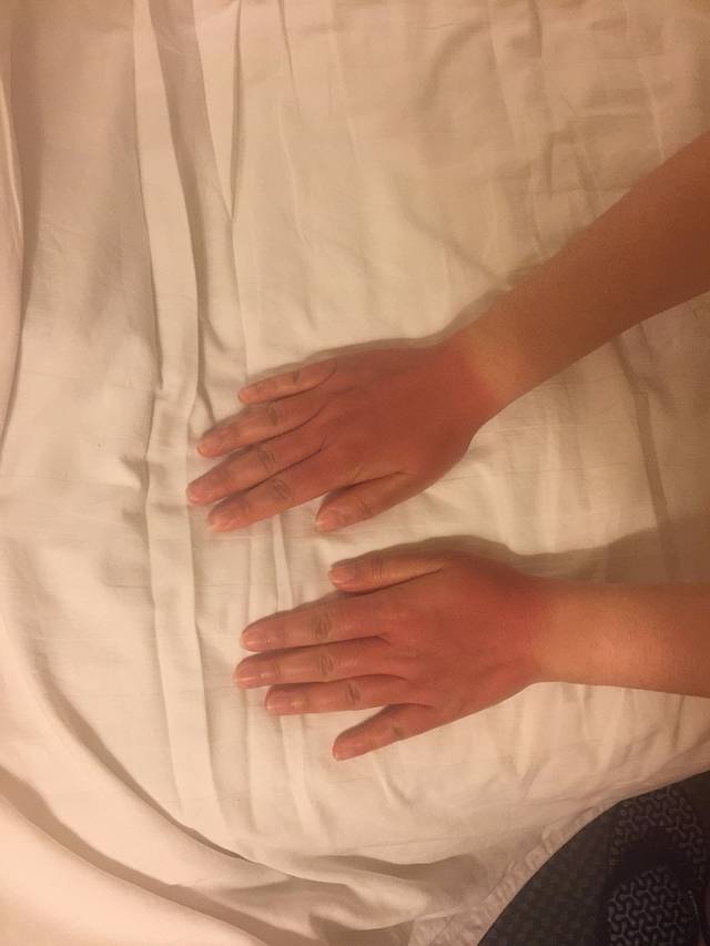 2. 防晒:海岛的紫外线经过海水的反射相信不用再多说了,阴天的紫外线会更强。第一天OW的实践学习是在能踩到底的海面上学习各种基础动作,之前在PADI的理论课上说潜水时不要涂抹防晒霜,不然会对水下生物造成破坏,我和猴胖完全认真的按照说的一点防晒没擦就去上课了。上午还好,阳光还不算毒辣,午饭过后继续在阳光下暴晒了快2个小时,我的手背就开始变得完全通红,等结束时教练说我已经晒伤了。当时的我没觉得怎么,晚上回到酒店手就开始红肿,第二天时碰到就会有麻麻的感觉,到第三天的时候只是在空气中有风拂过就有微微刺痛的感觉,从第四天才慢慢开始好转。其实擦了防晒霜练习面镜排水时,防晒霜会让眼睛进水的时候沙着疼,不便于动作的练习,而且防晒霜确实会对海洋环境造成破坏,所以还是不擦比较好。