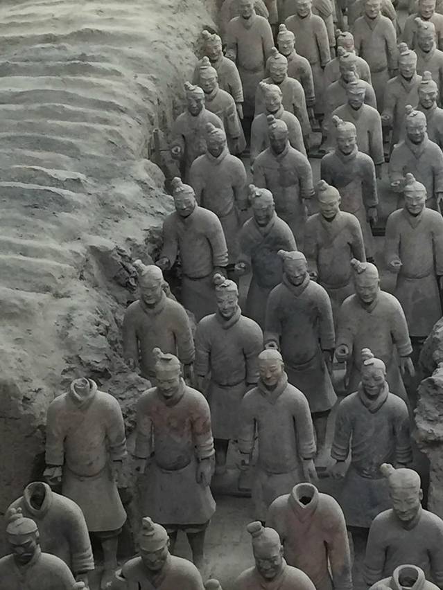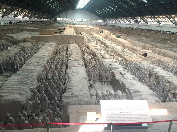 安检之后进入兵马俑大门,里边有摆渡车,15元还是20元忘记了,下车到达一号兵马俑遗址门口,心情有点激动,大学的时候一直期望来瞻仰下传说中的兵马俑,如今娃都上学了,才来!里边到底什么样呢,带着疑问,跟着导游进到里边,一进去就看到黑压压的人头,什么也没有了…导游说兵马俑在下边,让我们尽量往前站,可前边五六层人,根本进不去,只能一点点往里挪,(导游说暑假里天天人多的能挤到墙外边去,此话估计不虚!)慢慢的前边人走散了,打开一线天,哇!第一眼震撼到了,前边全是真人大小的陶俑,一直到展厅的尽头,多得数不清…仔细打量每个都不一样,神情各异,惟妙惟肖!手上以前应该都有棍棒类的兵器,不过现在没了,据说是项羽所为,但无从考证。也看过好多兵马俑的照片,但和实物在眼前确实没法比,感受不到现场那种霸气和威严,此时此刻站在这里似乎能感受到战旗飘扬,军队号角!