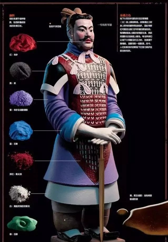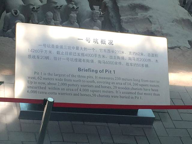 慢慢跟着导游往里走,一边听导游讲解挖掘过程,和修复过程,前边靠近游客的位置有一堆泥土,导游说那个就是俑坑里挖出来制作兵马俑的泥土,据说古人是把泥土,盐,碱按1:1:1的比例炒制而成,用手摸了下,很硬,再往前是很多正在修复中的陶俑,有的部分碎片还没找到,有的裹着保鲜膜在养伤,有的躺着,有的站着,不过我比较好奇,天天这么展览,文物工作者什么时候修复呢,难不成夜里?!儿子向导游提了一个很好的问题“兵马俑里边是空的吗”其实我一直以为是中空的,但导游说那样的话头重脚轻,兵马俑是站不住的,所以确切的说兵马俑是上空下实,但是现代的烧制技术烧制不出来这样的陶俑,只能烧制实心的,美国前总统来参观时带走的就是一个300斤重的实心将军俑仿制品!导游说如果一定要给兵马俑定个价的话那就是一两土一百元,大家算算送米国的那个300斤陶俑是多少钱呢,此处心有点疼!我们看到的兵马俑是陶土自然色,但兵马俑其实有很漂亮的矿物颜色,只是挖掘出来以后很迅速的氧化风化至使颜色脱落了,展馆人太多,导游也走得快,跟随导游走马观花似的来到3号坑遗址,(先逛3号坑遗址是因为卫生间在三号坑大厅的纪念品销售店)在销售店导游推荐给孩子买个陶俑带回去,我看了下一个最小的陶俑标价200元,估计是按一两黄土一百元算的吧,这个放家里感觉不太合适,毕竟是给始皇帝陪葬的东西,委婉的谢绝了导游,进了展厅,三号厅有南北厢房和车马房,车马房中有一辆驷马战车及四件兵马俑,战车是木制的 ,早已变为化石,依稀有车轮印记。人太多,三号坑简单看了下来到二号坑,二号坑是3个坑中最为壮观的军阵。它是由骑兵、战车和步兵(包括弩兵)组成的多兵种特殊部队。兵马俑的塑造,基本上以现实生活为基础,手法细腻、明快。每个陶俑的装束、神情更是各有差异。边上有盗墓者挖的洞,估计当年以为有宝贝哩!