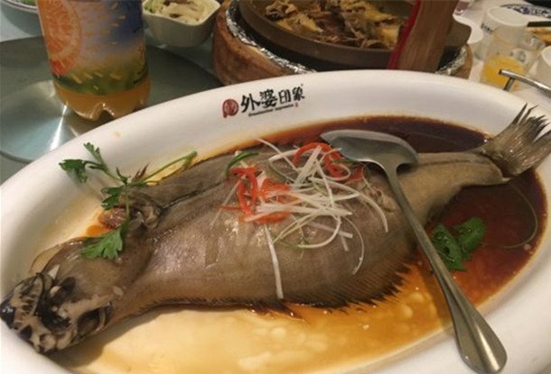 外婆印象果然不错,没丢娘家人脸,环境很好,饭菜味道鲜香,服务人员亲切热情,有种回家的感觉,我们点了清蒸鲈鱼,外婆红烧肉,鲜藕炒菌菇,蓝莓山药,三大碗陕西臊子面,还有一个什么菜不记得了,味道都很好,每道菜各具特色,鲈鱼比较鲜美无刺,适合老人,红烧肉酥烂绵软,里边还有好多鹌鹑蛋,孩子吃了好多,素菜清脆爽口,值得一提的是臊子面,浇头是炒制的素菜,配以精道的手工面条,拌起来油润鲜亮,放到嘴里很有嚼劲,对了,店里有免费的绿豆粥和米皮供客人自取,米皮劲道,浇淋红油蒜末,醋汤,味道好到无法形容,在我之后的三天里也分别吃过几次米皮,没有一处味道好过他家,临走那天特意想再次品尝他家米皮,结果去太晚没有了,遗憾!午餐一共花了219元,6个人吃的心满意足!