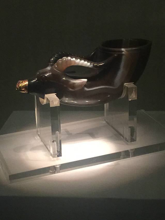 导游小哥哥讲得很好,老人也缓解了进来时的不适,听得精精有味,不时的拍些照片,儿子时不时地提问并抒发一些自己小小见解,当然大家都嗤之一笑!接讲解员带领大家来到大唐遗宝——何家村窖藏出土文物展馆,比较小,主要展示的是何家村出土的三十余件贵重文物,但件件展品都价值连城,大多是世界独一无二,包括陕西历史博物馆的“镇馆之宝”兽首玛瑙杯;同时还展出了窖藏出土金、银、铜币466枚,时代上迄战国,下至唐代。还有日本银币、波斯萨珊银币和东罗马金币,时代跨度千余年。