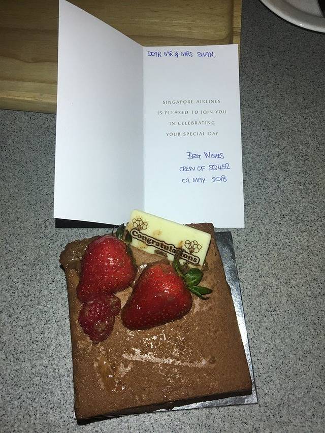 新加坡 航空准备的蜜月蛋糕,由于随我们奔波了很久都有点化了,味道还可以哦~