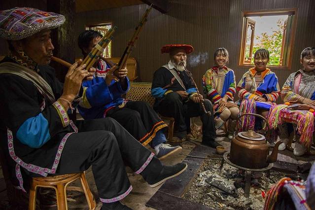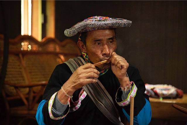 传唱所用到的乐器也是众多,常见的吹奏乐器有葫芦笙、列嘎嘟、闭闲等。葫芦笙是拉祜族主要的传统吹奏乐器,大小及规格不同,发出的音乐高低也不同。口弦、小三弦、牛腿琴是拉祜族地区常见的弹拔乐器。打击乐器则主要有木鼓、波罗谷、快列玛或切、排等。