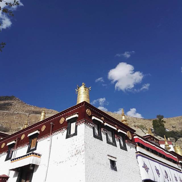 在街的对面,看一朵云走。穿着藏服的当地居民,晃动着经筒从身边穿行而过。明晃晃的日光在墨镜下滤去了刺眼,变得温和。随处走走停停,如那朵云一般抵达远方。