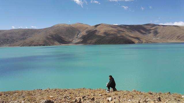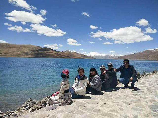 天高云阔下的羊湖,这是我们第一张合照。湖水的渐变蓝,深深浅浅美得想哭。