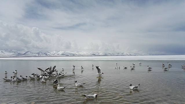 雪后的纳木错,与远处的冰山连成天际线。不知名的鸟儿,在水里打转、雀跃、腾空飞翔。白茫茫是它映射在高原上的光。把复杂暂时遗忘在这里吧,灵魂塞满了思虑,高原的风会吹得你头昏脑胀,这大概是人们常说在此处更易高反的原因吧。