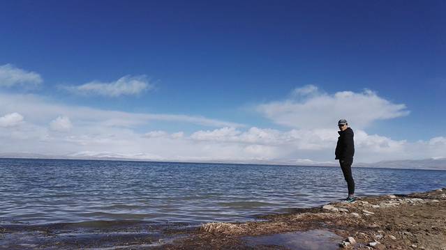 玛旁雍错的一角。水声在身后轻轻作响,此刻的我,一无所有却拥有一切。没有人会是一座孤岛,我一个人站着,等另一个人的到来。