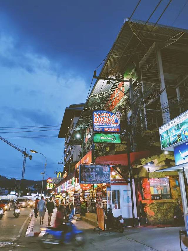 这里距离热闹的芭东海滩仅仅10分钟左右的车程,却呈现了完全不一样的景象。白日里闲来无事,我去了热闹嘈杂的芭东逛吃逛吃,毕竟这才是最有“泰”味儿的地方。天一黑,海鲜餐厅迎来了世界各地的游客,摩托车和Tuk-Tuk车也霸占了大部分街道。夜里的芭东,行人穿梭,热闹有趣。