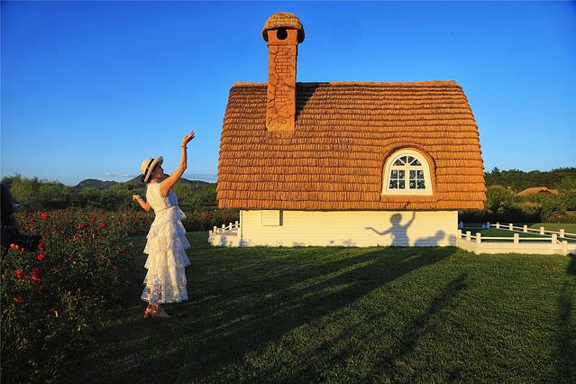 碧绿柔软的草地间,白色的爱情小屋是摄影人的取景地。尤其是傍晚时分,柔和的光晕洒在人们身上,连心情都变得浪漫起来。一朵朵玫瑰吐露着馥郁的芬芳,一棵棵小草跳跃着晶莹的光芒。无论怎么摆拍,都是一幅动人的画面。