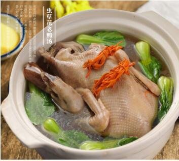 吃地闷羊再配一个虫草花老鸭汤。《本草纲目》中有记载:鸭肉有清热、排毒、滋阴、增强人体免疫力、补肺、润燥、养颜的作用,很适合秋补。原耕部落放养的土鸭,是在河塘自然环境中健康生长,是资格的土鸭,而煲汤选用的也都是一年以上的老鸭,所以虫草花老鸭汤的香味更浓。