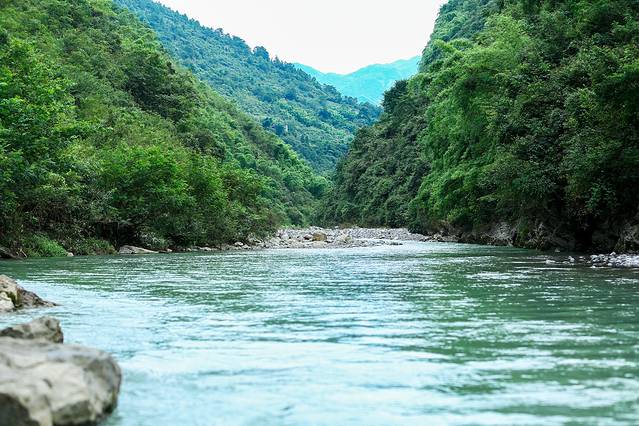 第一次来的时候还是6月初,恰逢下雨峡谷氤氲着雨雾。朦胧中,看不真切的漂流好似孕育着神秘仙女,也算是一次难得的雨漂体验。