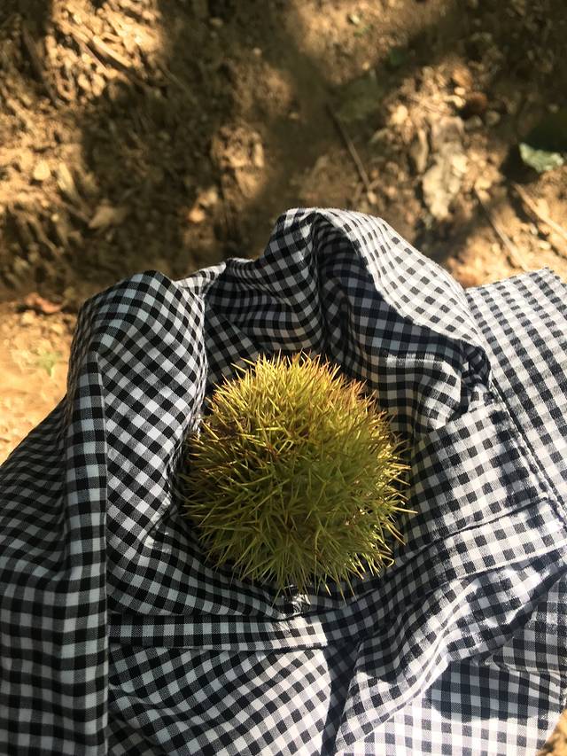看到没,我捡的板栗,哎呀呀,吃了那么久糖炒栗子,还从来没有见过它的庐山真面目呢,别说,这小东西还挺扎人,看着绿油油的一颗,我以为它的刺是软的呢,毫无防备的就被扎了,大拇指都扎出血来了,还有一根断刺,我挤了半天才弄出来,就那样,还疼了半个多小时呢,看到的兄弟姐妹们可要长点心了啊!别再被扎了!