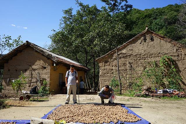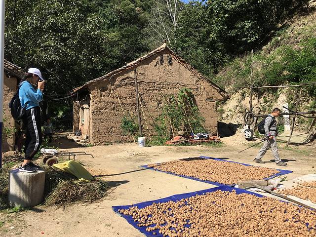 这里就有意思了,上坡中途,路过一户人家,门前晒了一大片核桃,伙伴们尝了几颗便大呼好吃,买了好多(图上这位是我们领队之一,路人)