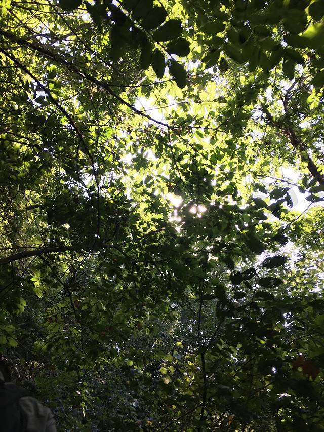 这张照片是我走着走着,发觉阳光忽明忽暗的时候抬头看了一眼,不禁感慨,“阳光透过叶子间的空隙洒下来,树影斑驳,花了人眼,却乱不了人心,我们看似行色匆匆,内心却从容坚定”。