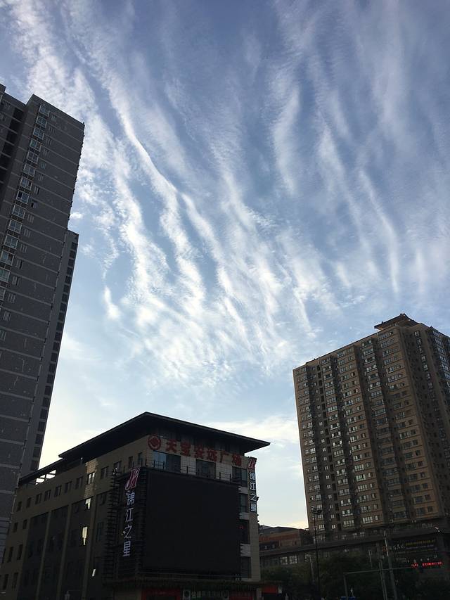 一大早的天空,蓝天白云,晴空万里的,正适合出游