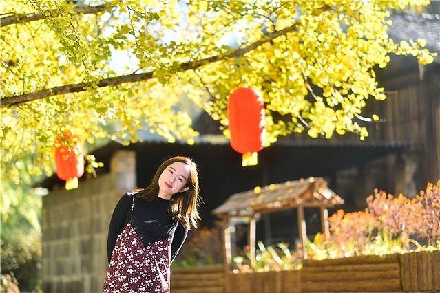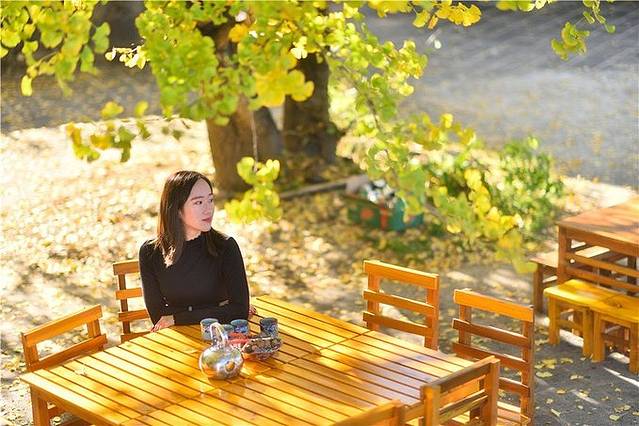 小小的庭院外有两棵很大的银杏树,树下摆几张崭新的木桌,朝阳透过银杏树叶把斑驳的光影撒在桌面,撒在地上。没有喧嚣、没有游人打扰,静静地摆姿拍摄。