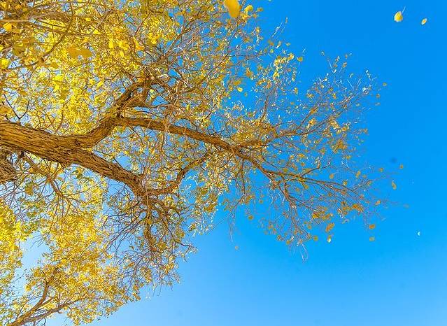 秋天里,金黄的树叶、干枯的树干、白茫茫的芦苇与湛蓝的天空、漆黑的道路能形成清晰明了的分界线和延伸感,善用你发现美的眼睛,用线条来构图吧!