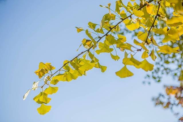 2.逆光是拍摄银杏的绝佳方案之一。黄色的银杏叶被阳光照射得愈加金光闪闪,若影若现的纹路和明暗不一的杏叶让画面更加生动、有层次。