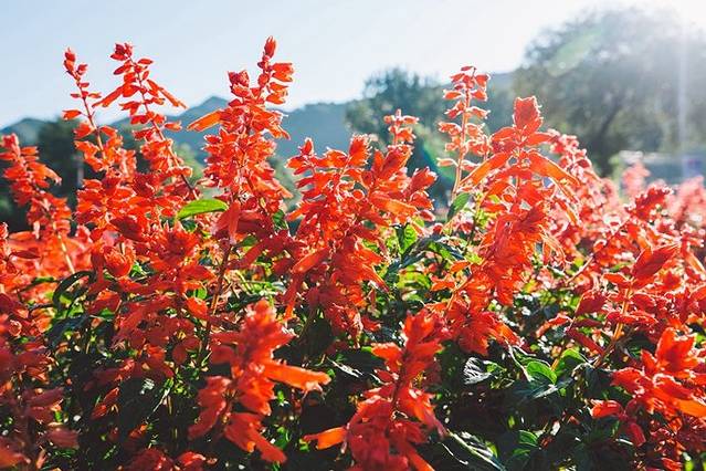 大气夺目的串红,像小铃铛一样一个个旋转着长在花梗上,柔柔软软的。