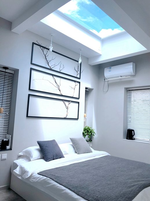 不同的房间布置的侧重点也不尽相同,天窗和百叶窗的使用,令室内光线变幻出了别样的景致。天窗上配了电动帘,白天看蓝天,晚间看星光,清晨怕晒影响睡眠的,可以在临睡前用遥控器关上窗帘,不要太贴心呀!