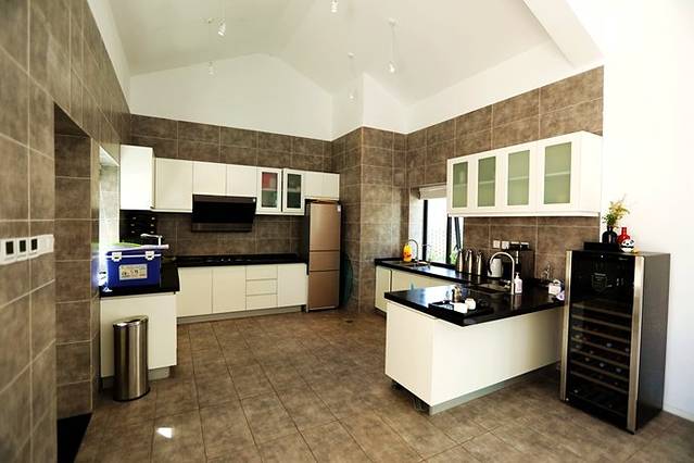 庭院中间的开放式餐厅+厨房,是一个完备的公共区域,看样子,同时容纳二十几位用餐没有问题。厨房设施设备也很齐全,一起来轰趴应该会很欢乐。