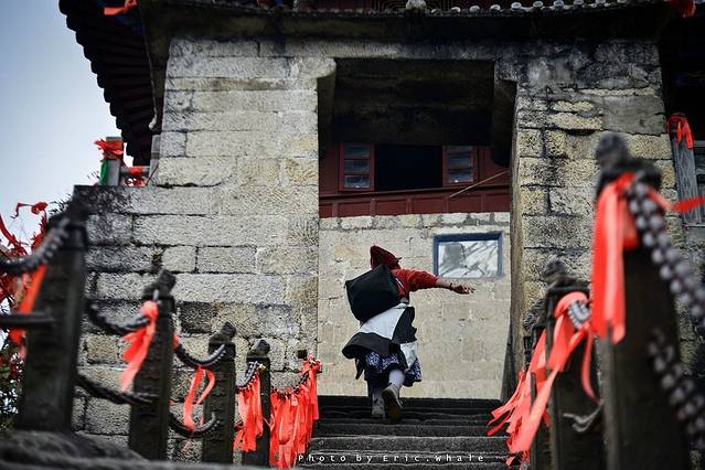 妙峰山素以古刹、奇松、怪石、异卉而著称,古刹当为山顶上的娘娘庙(惠济祠),从古香道上仰望,朱红色的庙墙矗立峰顶,在古松簇拥下,犹如天外飞龙,几欲乘风飞去,气势有点像武当山的金顶,也是那样遥立顶峰,远远在望,吸引着无数游人香客竞折腰,仿佛感觉自己走在天路历程上,有那么一点点朝圣的味道。