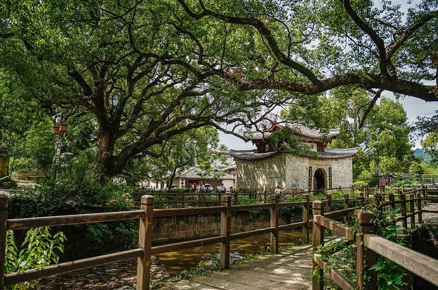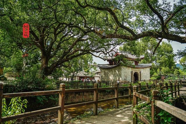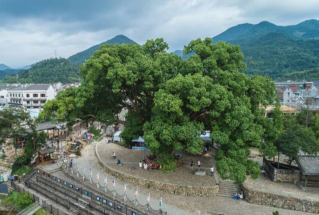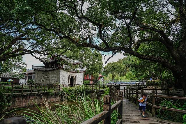 周围有十棵千年古樟,织成了一片遮天大网,为村民们遮阳避雨,也是孩子嬉戏玩耍的场所,在古堰村,有这样一个传统,孩子出生之后会抱到古树前,举行一个朝拜仪式,拜古树为干娘,保佑孩子长命百岁。