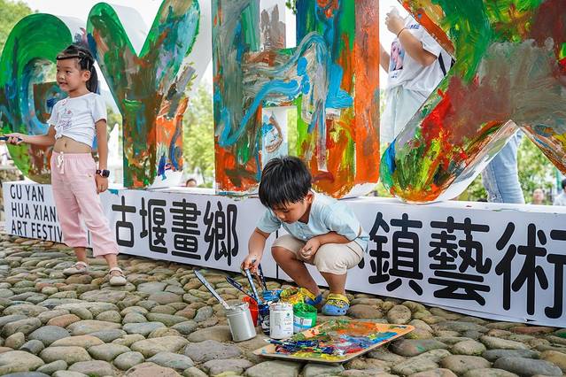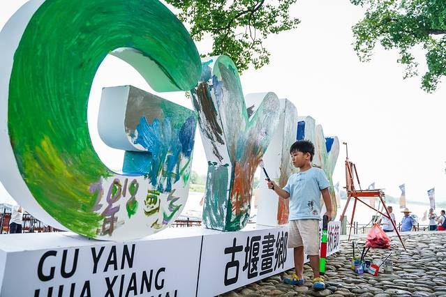 带着孩子赶了一个早场,主办方已经布置好了画笔,让孩子们在古堰画乡的LOGO上自由涂鸦。