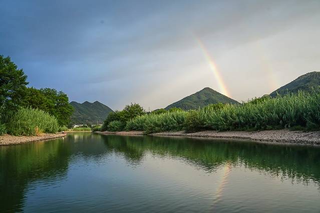 从古堰上船,一路沿着松阴溪返回画乡,傍晚时的江景变得更加迷人,东面的雨水将停,两道彩虹挂在天上,画乡变得色彩缤纷而又浪漫无比。