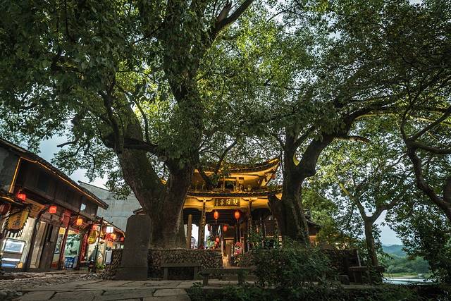 码头之上有两棵相生相邻的千年古樟,古樟之下是双荫亭,这也是滨江古街的起始点,傍晚时分,这是人们畅谈聊天的集会之所,若是遇上节庆,还有音乐评弹。