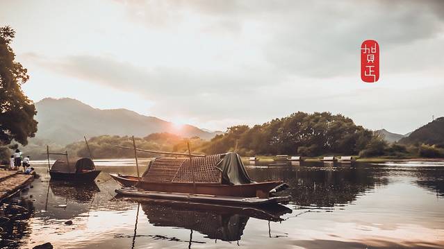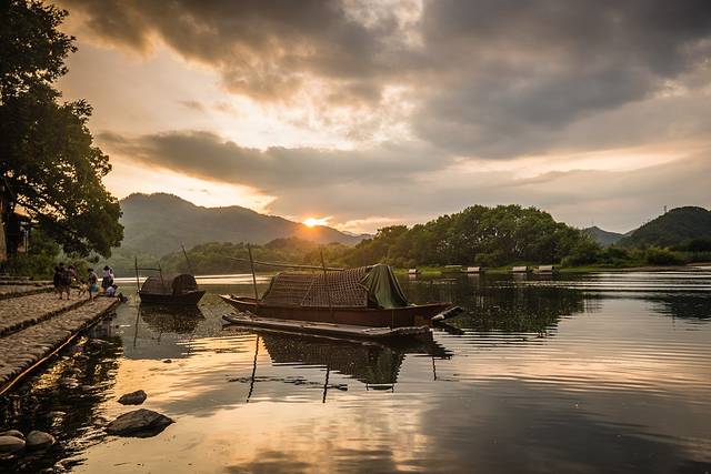 西面的云层有一点厚,太阳透过云朵的间歇洒下来把整个江面都染成了金黄色,远山下的乌篷船挂着白白的帆,眼前的画面像一幅电影,触及了我的心灵。