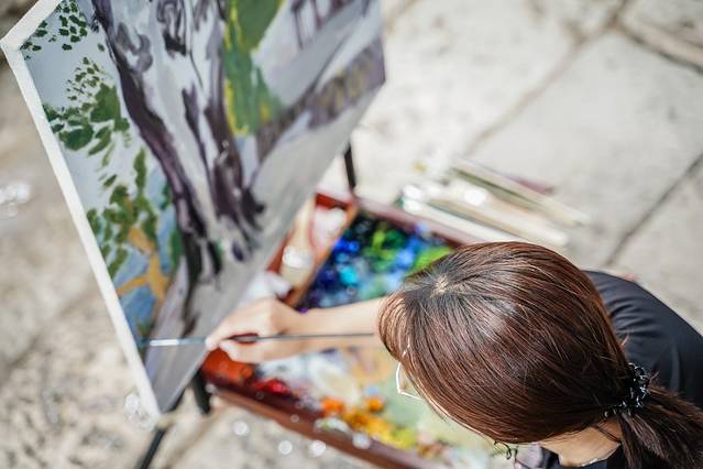 她用颜料表达着光影,画笔在幕布上跳舞,上下横飞,潇洒自如,让人看得痴迷,我要让孩子在这呆上几天,让他感染这画乡的氛围,这是最好的启蒙,要让他知道绘画到底是怎么一回事。