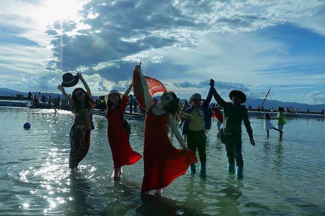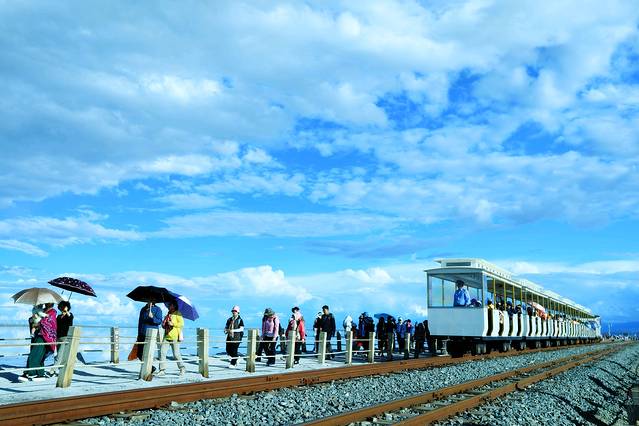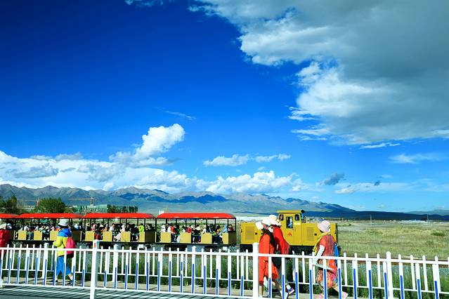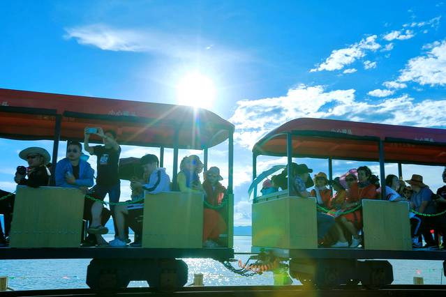 此时的盐湖游人如织,大进大出。首先吸引人的地方,就是它有一条通往湖心的小铁轨 。