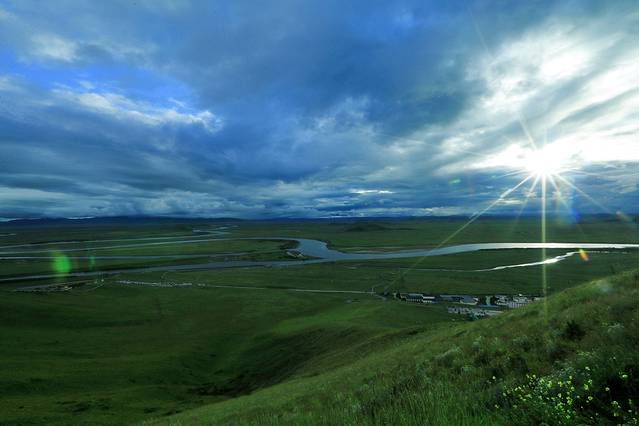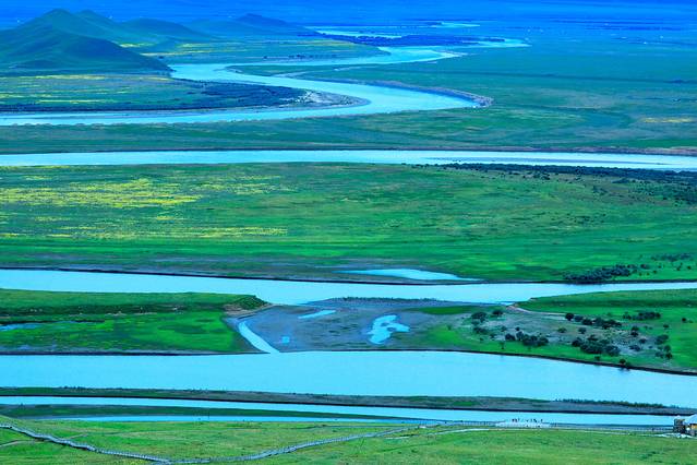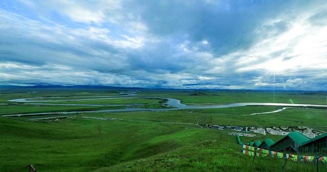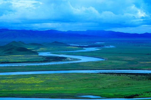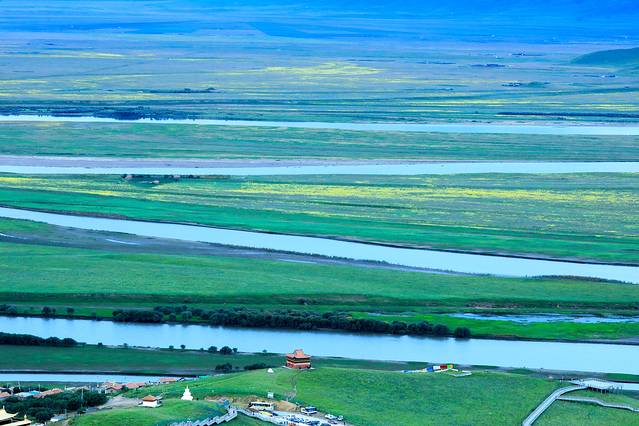 黄河九曲第一弯地处四川、青海、甘肃交界处,位于若尔盖大草原腹心地带。黄河自西南方甘肃一侧从容走来,到这里划了一个"S"弯,与白河交汇后,又折向北边青海流去。