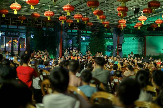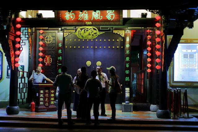 经过艰苦的长途跋涉,终于在晚上九点钟行驶到成都市中心的如家酒店附近。我们个个饥肠辘辘,但这还没到解决的时候,下车后排第一位的是去欣赏川剧一一蜀风雅韵。