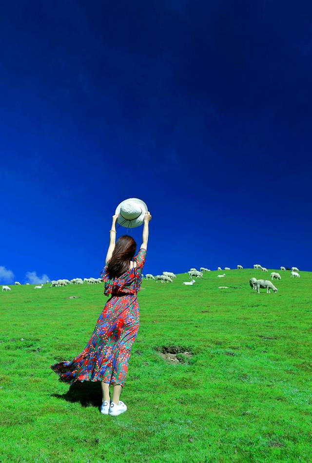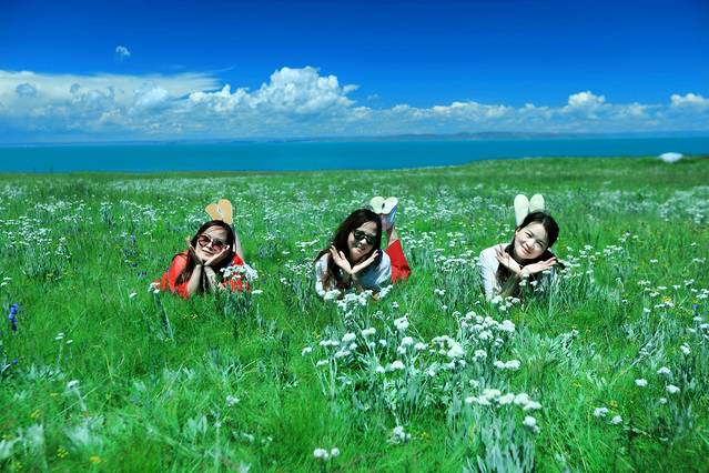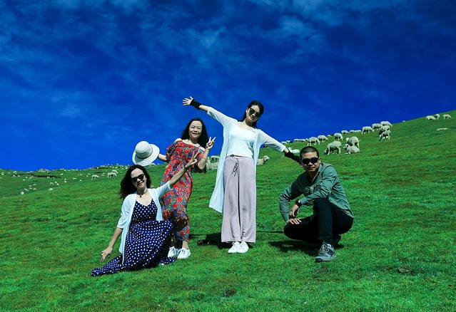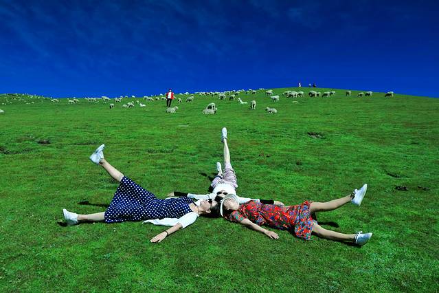 姑娘们下车来,以蓝天为顶,以大地为房,以绿草为床,以绵羊为伴,站着,躺着,倒着,卧着,各种拍,内心好不欢腾!