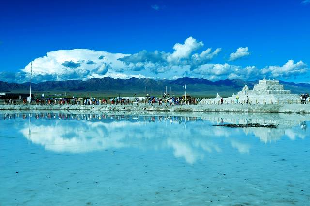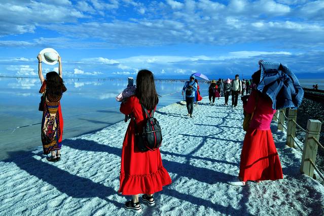 景色不负人,长长的人影印在洁净的"盐路"上,在蓝天白云的衬托下,人犹如穿越在梦境之中。
