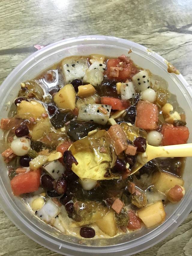 等待间隙也没闲着,在隔壁买了串妹花式冰粉,也是家人气比较高的店。冰粉拍照好看,味道也不错,用料很足,特喜欢里面的炒花生。