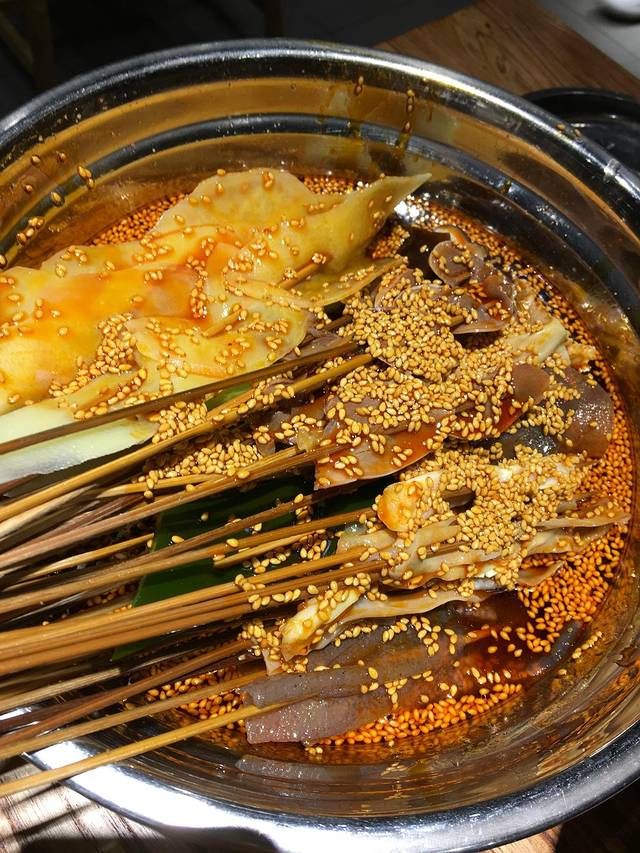 和串串不同,钵钵鸡的菜都是熟的,吃起来是凉的。选好菜,厨房配上汤汁就齐活了。要了麻辣红汤和藤椒两种汤底。藤椒比较清香,吃完几口嘴就麻了。红汤味道也不错。