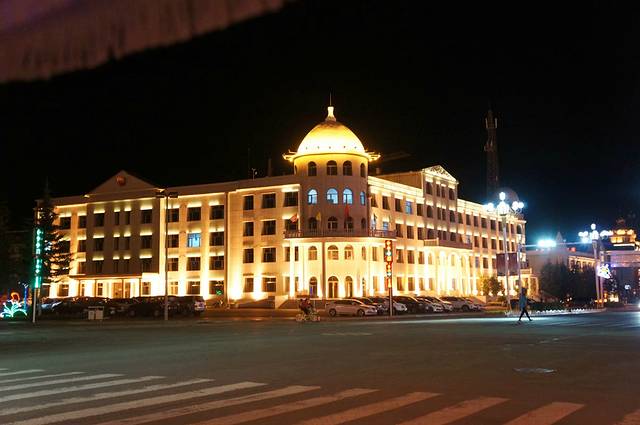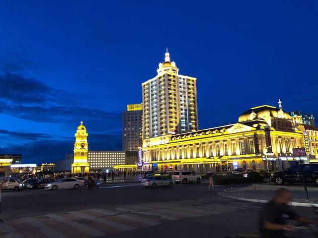 夜晚的满洲里,很有异域风情。凉风习习,走在满洲里大街上,欣赏着美丽的夜景。这里的建筑既有北方建筑的高大结实,又有点俄罗斯的风味,大多建筑的顶部是圆顶带尖的。